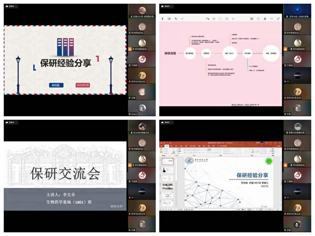保研至浙江大学060net永利的季康凡主要分享了自己的保研经历,对保研流程也做出的详细的介绍,并着重介绍了夏令营申请的时间节点和联系导师的时间选择,同时他还强调了大创项目经历对于保研的重要性。保研至上海药物研究所药理系的李文卓比较了保研至研究所和高校的区别,介绍了和保研有关的论坛及APP等信息获取途径。保研至北京协和医学院(清华大学医学部)药剂学的刘晗介绍了保研推荐信的相关注意点,强调了面试和英语的重要性。保研至本院药理学的毛丽丹·热合木吐拉分别介绍近三年的保研政策、加分情况、保研成绩构成以及复试细则等,着重强调了提前准备的重要性。保研至上海科技大学的杨明磊对比介绍了上海科技大学,北京中医药大学,中国中医科学院的保研基本流程,并对保研材料准备以及面试过程中遇到的问题进行了详细的阐述。